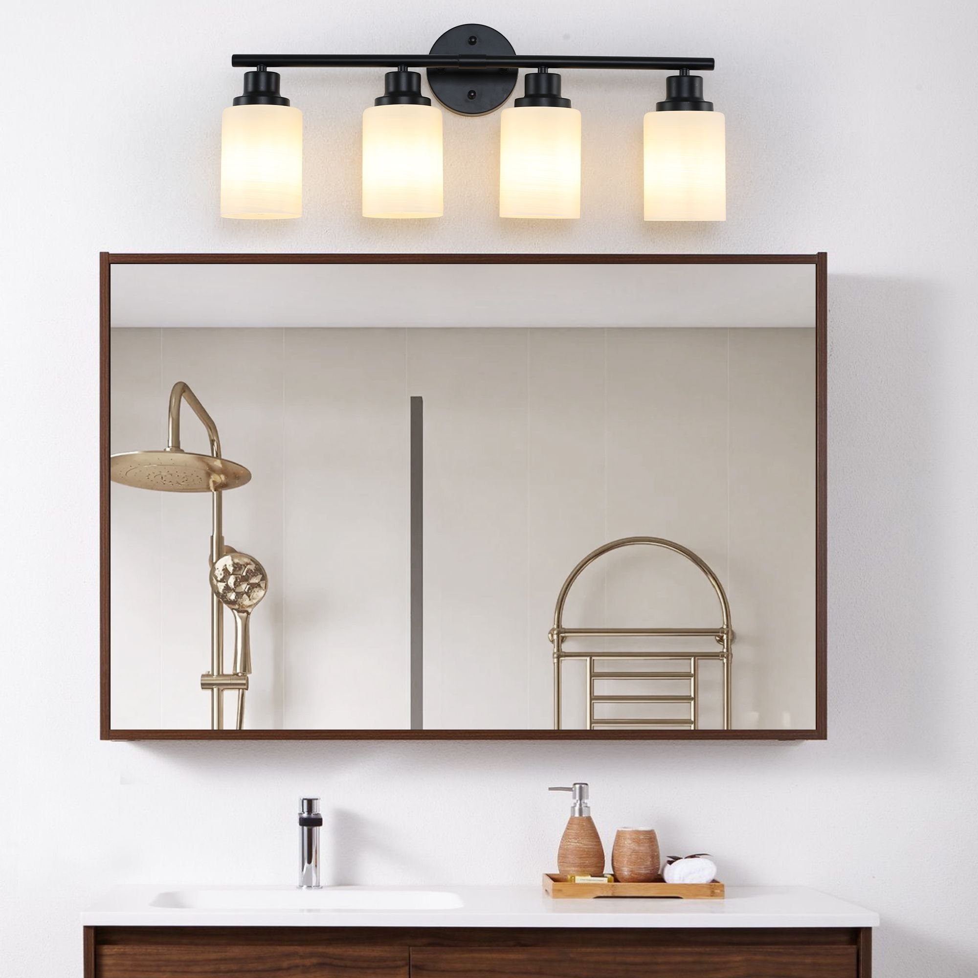 Modern 4-Light Vanity Bathroom Mirror Light, Frosted White Glass with Black Iron FrameColor: Black + WhiteMaterial: Iron + GlassBulb type & quantity: 4*E26 bulbs (The product without bulbs!)Bulb Wattage: Max 60WApplicable voltage: 110-120VPower Supply: Hard-WiredEase of installation: EasyApplicable scenarios: Bedroom, Bathroom, Dressing RoomThis 4-light mirror headlight features a simple yet stylish design that combines white frosted glass and a black iron frame for an elegant yet modern look. High quality materials guarantee the durability of the product, and soft lighting brings a warm atmosphere to your bathroom, bedroom or powder room. Versatility makes it ideal not only for bathrooms, but also for Spaces that require good lighting, such as powder rooms and bedrooms. Easy to install, even for non-professionals. Compatible with LED bulbs(bulb not included), energy saving and environmental protection, for you to save electricity at the same time, reduce the trouble of frequent bulb replacement, is your home decoration and lighting perfect choice.