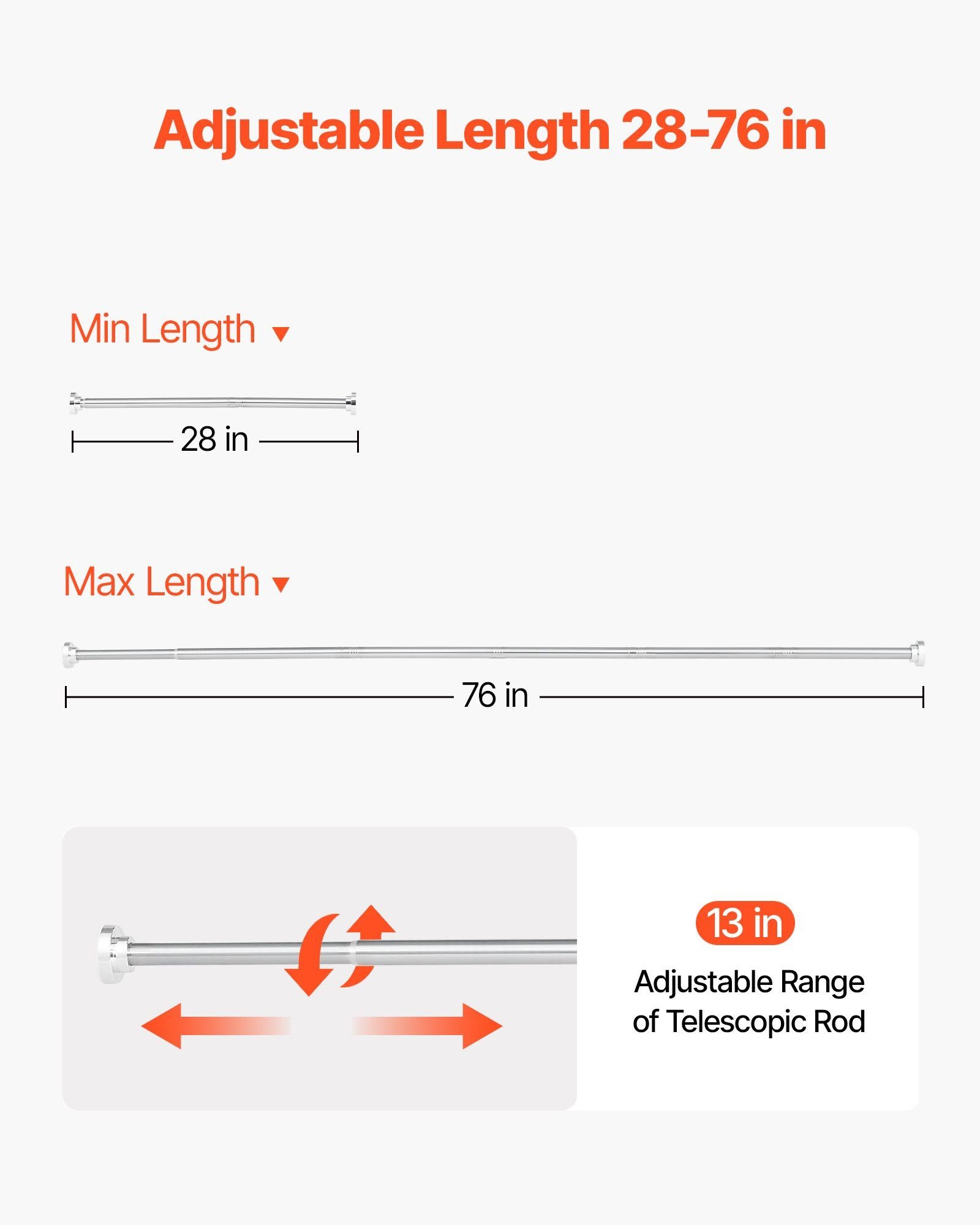 This shower curtain rod features a no-drilling design for easy, tool-free installation. With an adjustable length ranging from 28 to 76 in, it can be flexibly adjusted to fit different spaces while maintaining stable support without falling.