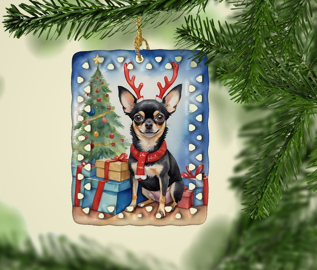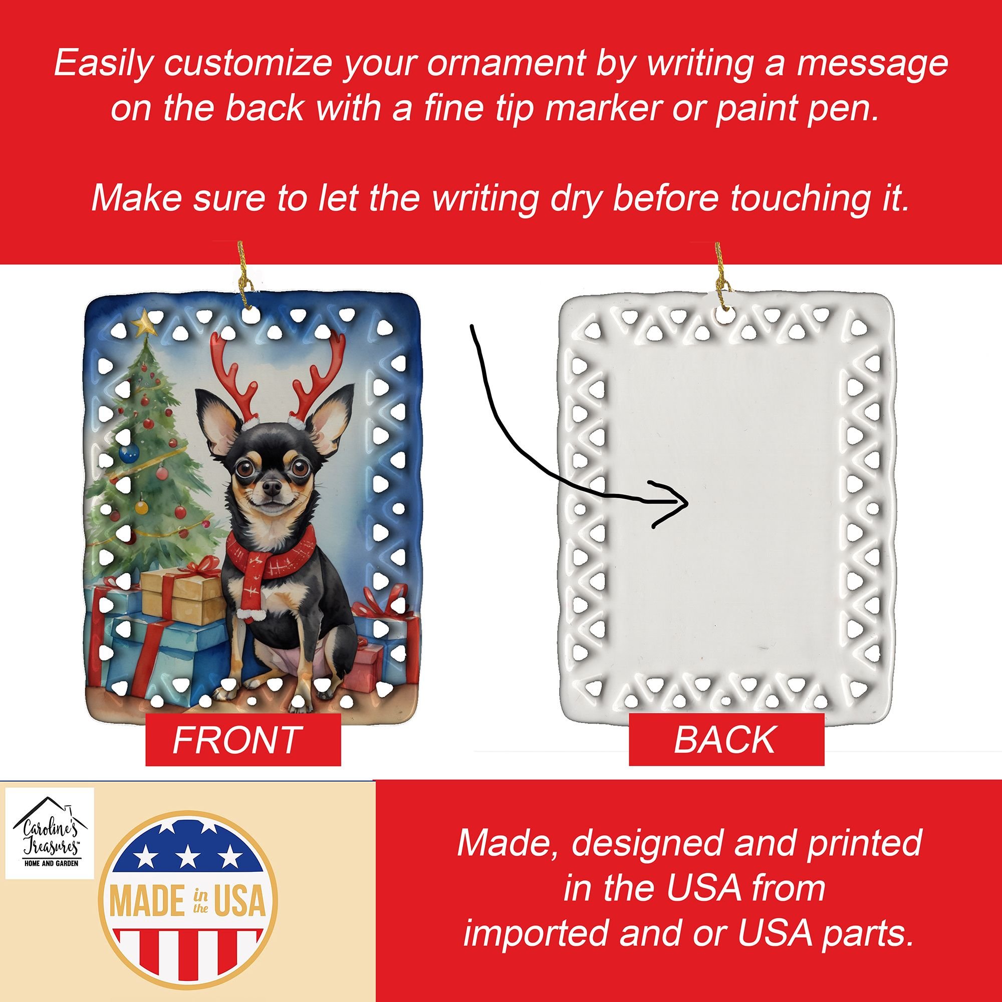Porcelain Ornament featuring breed specific Chihuahua artwork. Celebrate Christmas with this Christmas Ornament. Add a unique, personal touch to your holiday decor with our Rectangular Lattice Porcelain Ornament. Perfect for creating cherished memories, this high-quality ornament shines under festive lights, reflecting warmth and joy throughout your Christmas tree. Crafted with a glossy finish, it showcases vibrant, full-color artwork contributed by our talented artists, ensuring your tree is adorned with a burst of color and holiday spirit. What sets this Porcelain Ornament apart is its customizable white back. Use a paint pen or permanent marker to write a heartfelt message, commemorate a special year, or mark an unforgettable date, turning this ornament into a keepsake that will be treasured for years to come. For best results, allow any personalization to dry thoroughly before handling. Each ornament comes complete with a delicate gold cord, making it easy to hang and display. Proudly made in the USA, this ornament measures 3.375 x 2.625 inches and is a thoughtful gift for pet sitters, teachers, family members, or anyone who would appreciate a little extra holiday magic. Bring style, charm, and a touch of personal meaning to your Christmas tree with this beautifully designed ornament..